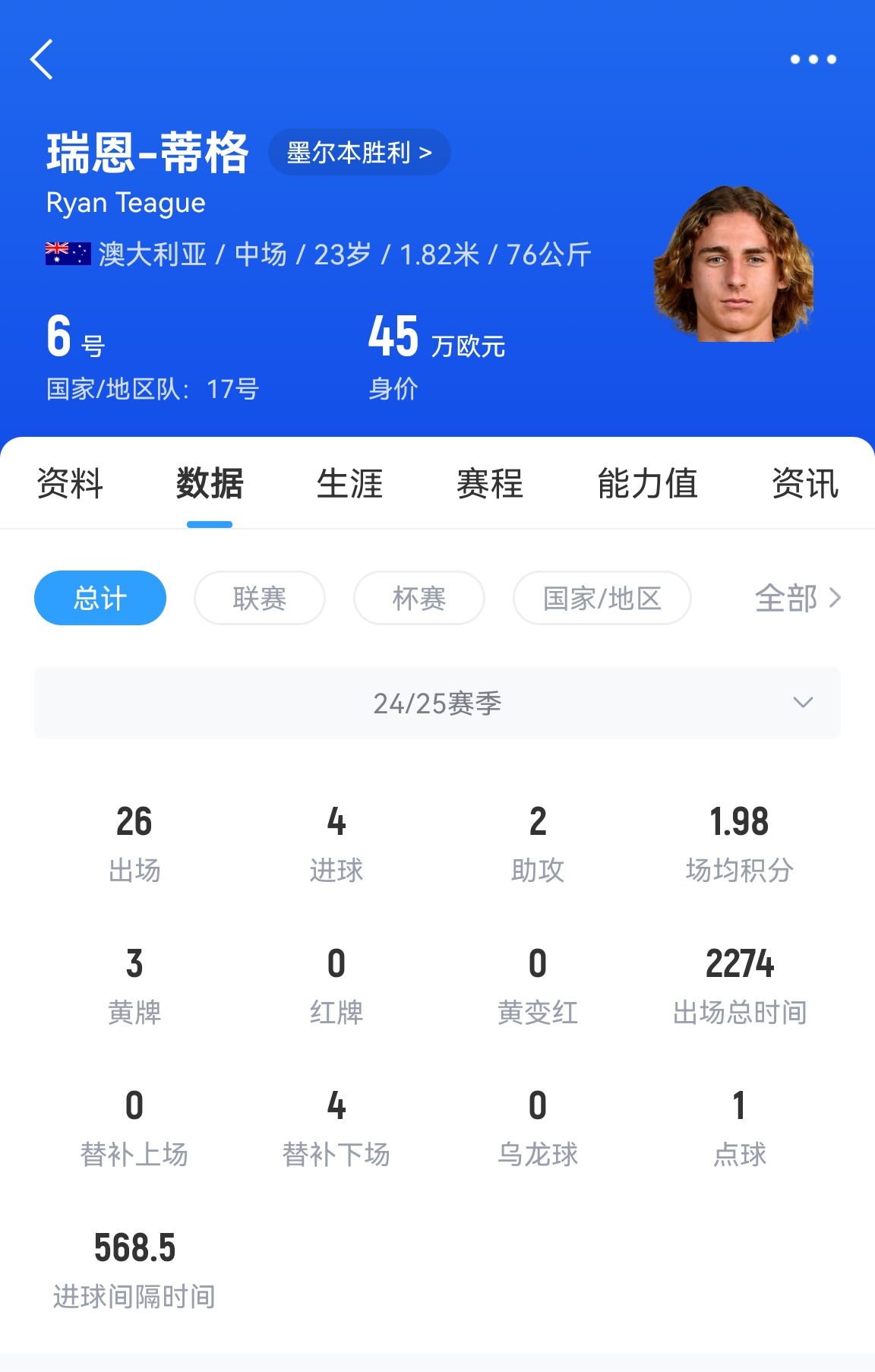 蒂格本赛季为墨尔本胜利出场26次打入4球2助攻,他的德转身价为45万欧元。