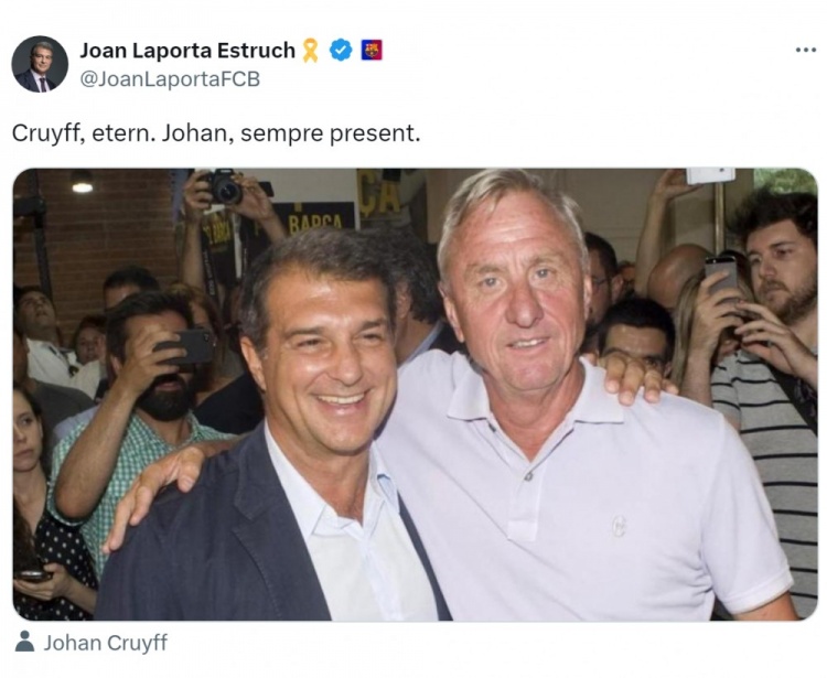 克鲁伊夫逝世九周年之际,拉波尔塔在社交媒体上晒出与这位俱乐部传奇的合照,并配文:“克鲁伊夫,永恒不朽;约翰,永伴我们。”