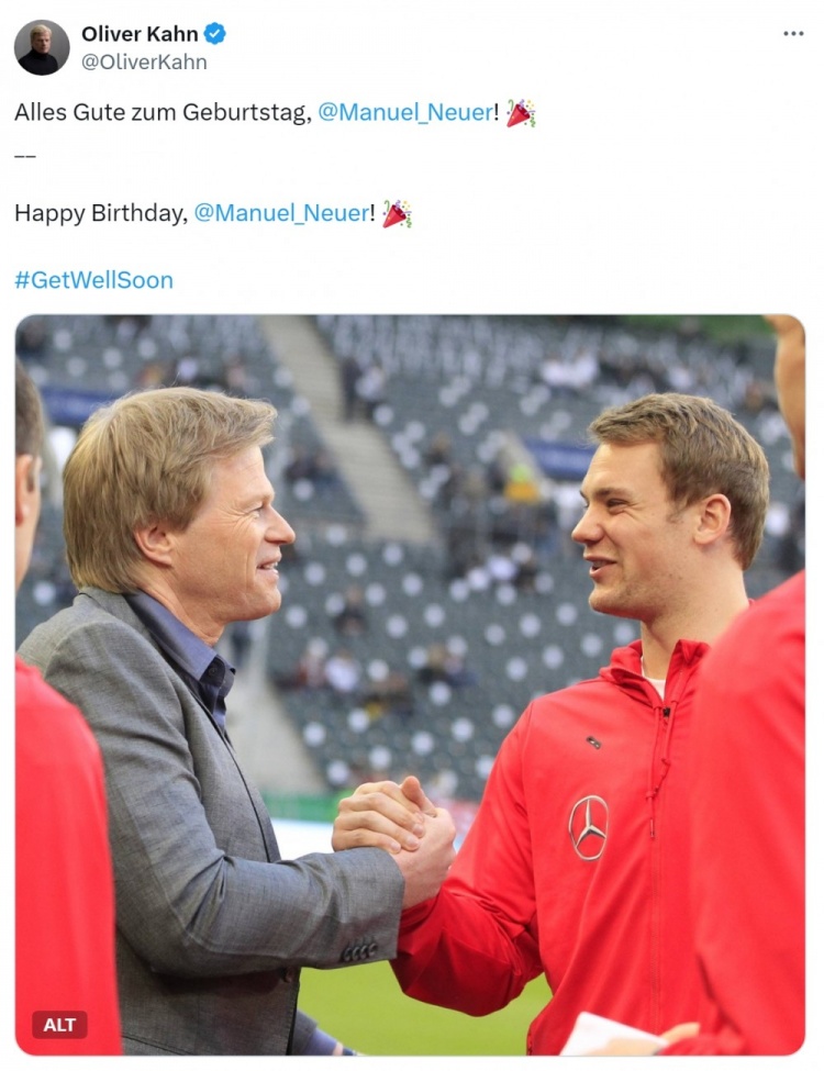 卡恩社媒晒出与诺伊尔的合照,配文:“生日快乐,诺伊尔!”
