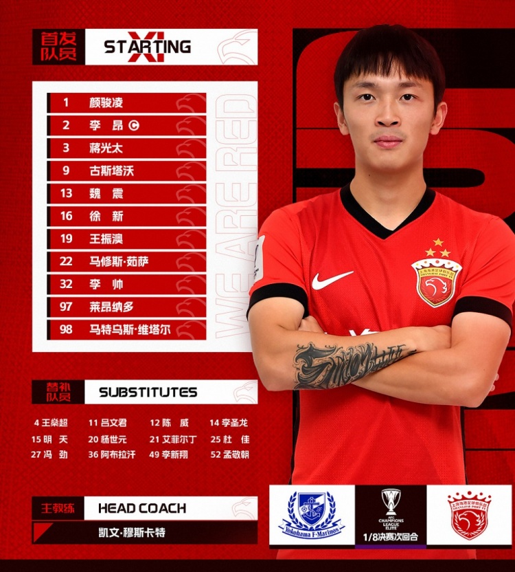 今日首发——亚冠精英联赛1/8决赛次回合,横滨水手vs上海海港